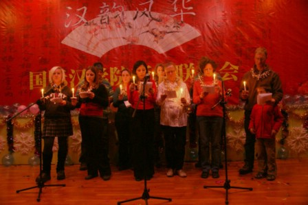 2007级对外汉语专业带来的《shining kiss》拉开了新年联欢会的序幕。活力青春、古灵精怪的动感舞姿,瞬时吸引了全场观众的目光。颇具创意的歌舞剧《罗密欧与林黛玉的爱情奏鸣曲》,既跨越了历史时空,又拉近了中西文化的距离。妙语连珠的相声,极具风雅的古诗文配乐朗诵、中外硕士研究生用歌舞演绎的《中国话》以及有“钢琴王子”之称的韩国留学生郑荣光、李起京带来的钢琴伴唱,为晚会增色不少!