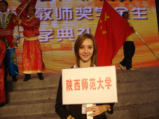 我校奖学金生代表意大利学生潘美琳在典礼台上
