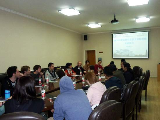 11月19日上午,澳大利亚塔斯马尼亚大学短期汉语研修班开班仪式在必赢3003no1线路检测中心一楼会议室举行,院长张建成、副院长吴殿华、留学生管理办公室主任蔺丰辉、汉语教研室主任邵英老师等和塔斯马尼亚大学亚洲文化与语言学院副院长Mark Harrison博士、澳方带队老师林嘉惠博士及十名澳方学生参加了开班仪式。仪式由留学生管理办公室冯伟老师主持并翻译。